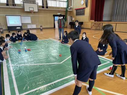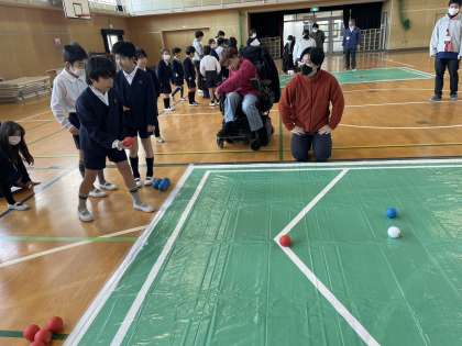 大正区社会福祉協議会とヘルプセンター・スクラムの方々に来ていただき、「ボッチャ」の体験をしました。