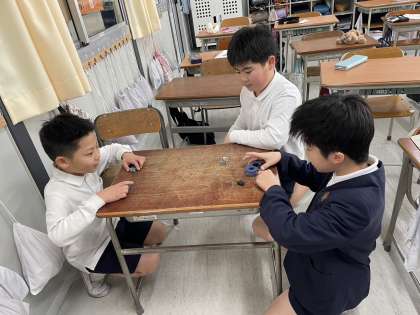 休み時間教室でボッチャの続きを消しゴムを使ってしていました!