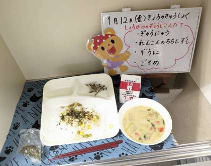今日の給食は、正月の行事献立です。れんこんちらしずし、牛乳、ぞう煮、ごまめです。