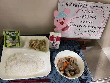 今日の給食は、ごはん、牛乳、筑前煮、ツナとキャベツのごまいため、まっ茶大豆です。