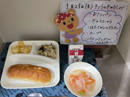 今日の給食は、おさつパン、牛乳、ほたて貝のグラタン、スープ、パインアップル(缶)です。