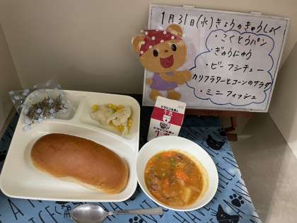 今日の給食は、黒糖パン、牛乳、ビーフシチュー、カリフラワーとコーンのサラダ、ミニフィッシュです。