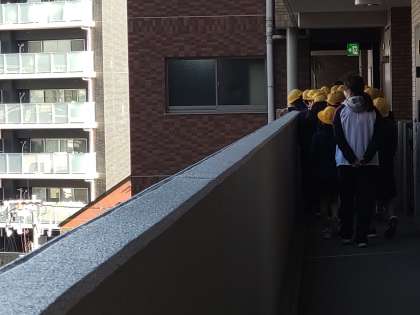 地震の後、津波が来ることを想定して、隣のマンションの4階以上に避難する訓練を行いました。