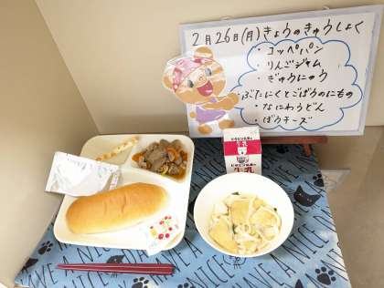 今日の給食は、コッペパン、牛乳、豚肉とごぼうの煮もの、なにわうどん、棒チーズ、りんごジャムです。