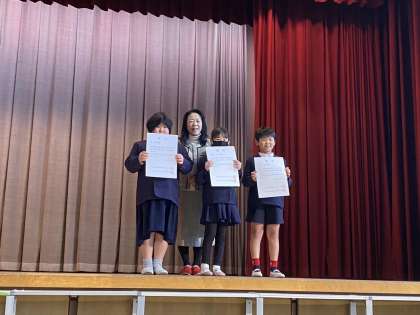 図工展や夏休みの自由研究でがんばった児童たちの表彰をしました。