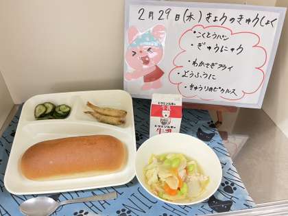 今日の給食は、黒糖パン、牛乳、わかさぎフライ、洋風煮、きゅうりのピクルスです。