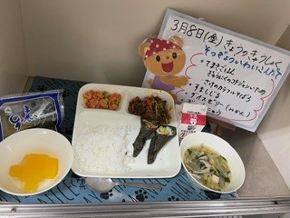 今日の給食は、手巻きご飯(牛肉のコチジャンいため・さけのカラフルそぼろ)、すまし汁、ダイスゼリー(みかん)、牛乳 です。