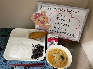 今日の給食は、ごはん、牛乳、いわしフライ、みそ汁、牛ひじきそぼろ です。