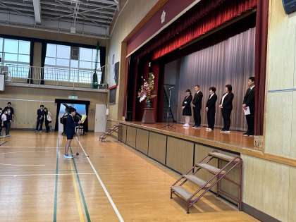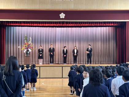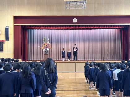 まずは、講堂で新しく着任した教職員の着任式を行いました。初めに転入生の紹介もありました。
