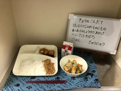 今日の給食は、「鶏肉とじゃがいもの煮もの」「あつあげのしょうゆだれかけ」「紅ざけそぼろ」「ごはん」「牛乳」でした。