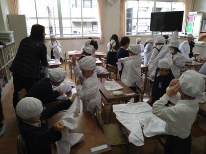 今日から給食が始まりました。1年生は、給食着に着替える練習から始まります。みんなしっかり説明も聞いていました。