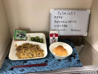 今日の給食は、「焼きそば」「きゅうりのしょうがづけ」「ソフト黒豆」「ミニコッペパン」「牛乳」でした。