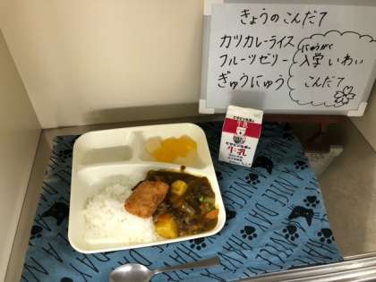 今日の給食は、「カツカレーライス」「フルーツゼリー」「牛乳」でした。