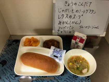 15日(月)の給食は、「じゃがいものミートグラタン」「レタスのスープ」「みかん(缶詰)」「コッペパン」「ブルーベリージャム」「牛乳」でした。