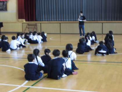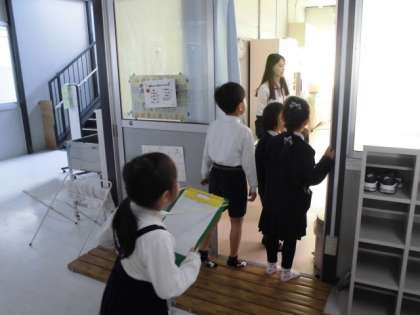 グループを作って、2年生が1年生を案内しながら「学校探検」をしました。2年生はやさしく1年生の手をつなぎながら案内をしていました。