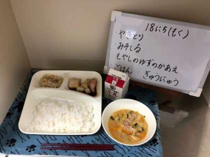 今日の給食は、「焼きとり」「みそ汁」「もやしのゆずの香あえ」「ごはん」「牛乳」でした。