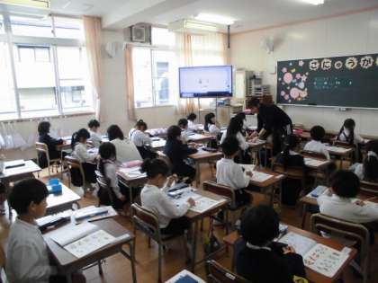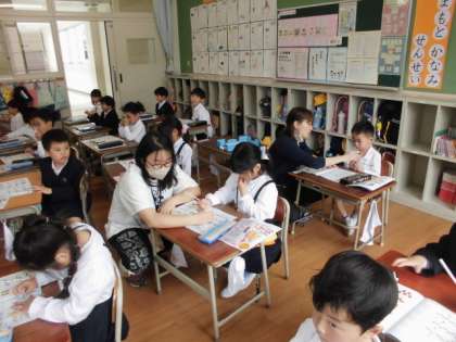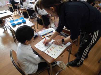 1年生が、算数で「1から10までのかず」の学習をしました。一人一人のノートを先生が机間巡視して丸付けをしました。みんなとても丁寧に書けていました。