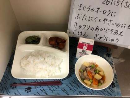 今日の給食は、「まぐろのオーロラ煮」「豚肉と野菜の煮もの」「きゅうりの赤じそあえ」「ごはん」「牛乳」でした。