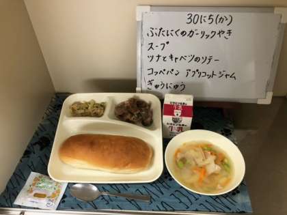 今日の給食は、「豚肉のガーリック焼き」「スープ」「ツナとキャベツのソテー」「コッペパン」「アプリコットジャム」「牛乳」でした。