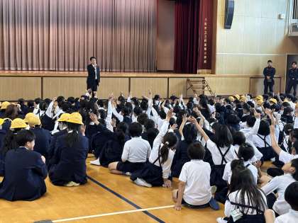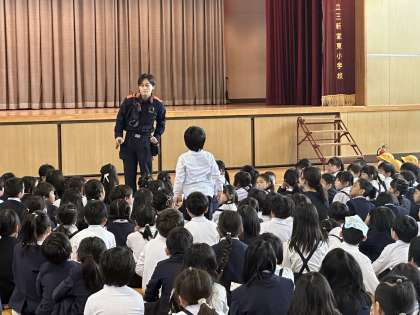 消防署の方からは、消火器の使い方について説明をしていただきました。また、「お」「は」「し」「も」のルールや、「廊下は走らない」「先生の話は静かに聞く」など、普段から心がけて学校生活を送るように確認をしました。