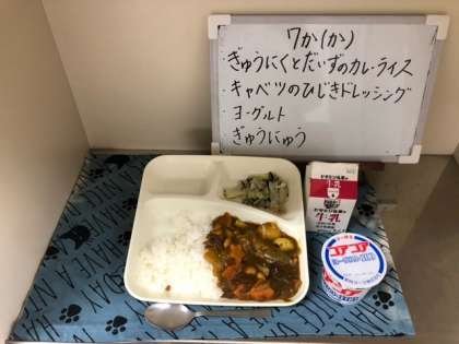 5月7日(火)の給食は、「牛肉と大豆のカレーライス」「キャベツのひじきドレッシング」「ヨーグルト」「牛乳」でした。