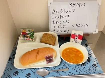 今日の給食は、「一口トンカツ」「ミネストローネ」「豆こんぶ」「コッペパン」「いちごジャム」「牛乳」でした。
