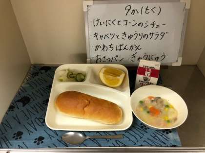 今日の給食は、「鶏肉とコーンのシチュー」「キャベツときゅうりのサラダ」「かわちばんかん」「おさつパン」「牛乳」でした。