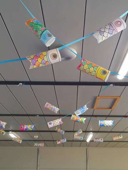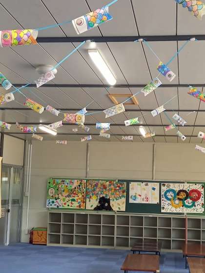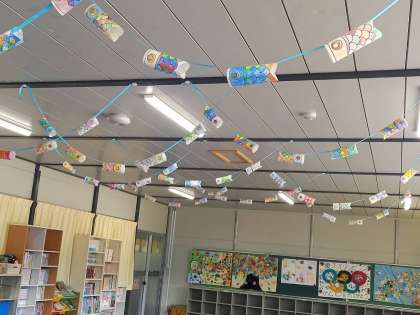 子どもたちがきれいに塗った色とりどりのこいのぼりが、いきいき活動室を泳いでいます