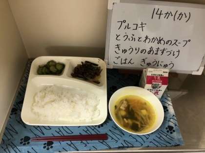 5月14日の給食は、「プルコギ」「とうふとわかめのスープ」「きゅうりの甘酢づけ」「ごはん」「牛乳」でした。