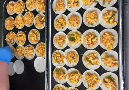 給食の変わりピザは、ぎょうざの皮に、ツナ、コーン、ピーマン、ピザソース、チーズを混ぜ合わせた具をのせ、オーブンで焼いています。
