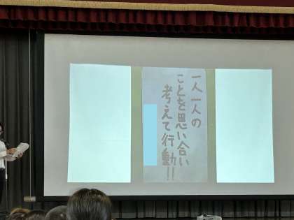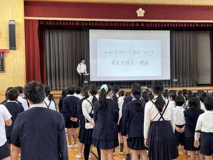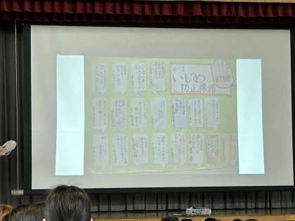 5月20日の児童朝会ではその作文や標語などを紹介しました。どのクラスもしっかり話合い、しっかりといじめについて考えていました。