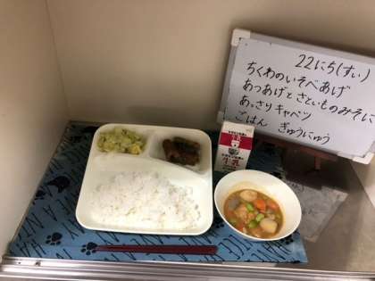 今日の給食は、「ちくわのいそべあげ」「あつあげとさといものみそ煮」「あっさりキャベツ」「ごはん」「牛乳」でした。