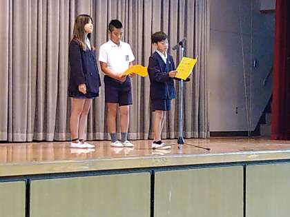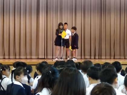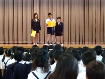 6月3日〜6月7日まで児童会のあいさつ週間の取組があります。児童朝会でお知らせがありました。あいさつの5つのポイントなどの話がありました。