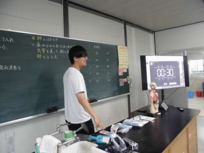 6年生が、理科の学習で肺のはたらきについて実験を行いました。はじめに聴診器で、30秒間の心拍数をはかり、その後1分間もも上げやジャンプなどの運動をして、もう一度心拍数をはかりました。ほとんどの人が心拍数は上がっていました。