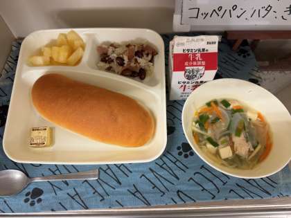 今日の給食は、「金時豆の中華おこわ」「中華スープ」、パインアップル(缶詰)、「コッペパン」、「バター」、「牛乳」でした。