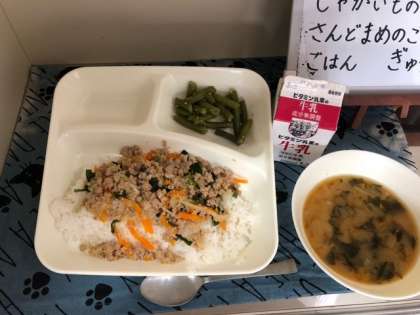 6月4日(火)の給食は、「豚ひき肉とにらのそぼろ丼」「じゃがいものみそ汁」「さんどまめのごまあえ」「ごはん」「牛乳」でした。