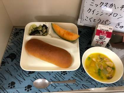 今日の給食は、「鶏肉とかぼちゃのシチュー」「ミックス海そうのサラダ」「クインシーメロン」「黒糖パン」「牛乳」でした。