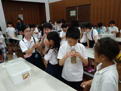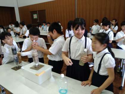 砂でろ過をする実験に挑戦します。まずは、水のにおいを確認します。