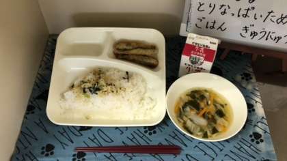 今日の給食は、「いわしてんぷら」「五目汁」「とりなっ葉いため」「ごはん」「牛乳」でした。