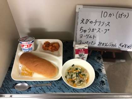 今日の給食は、「えびのチリソース」「中華スープ」「ヨーグルト」「コッペパン」「みかんジャム」「牛乳」でした。