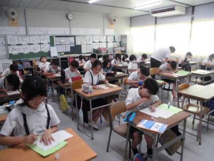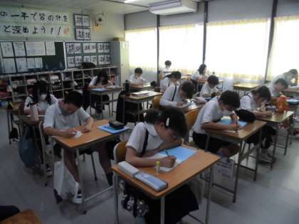 毎日5時間目が始まる前の5分間に「三東タイム」を行っています。月・水・金曜日は、「計算タイム」で、火・木曜日は、「ミュージック・タイム」を行っています。今日は「計算タイム」でしたが、始まったとたんに教室が静まり返って、みんな集中して計算問題に取り組んでいました。