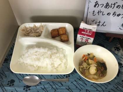今日の給食は、「八宝菜【「卵」の除去食対応献立】」「あつあげのピリ辛じょうゆかけ」「もやしの中華あえ」「ごはん」「牛乳」でした。