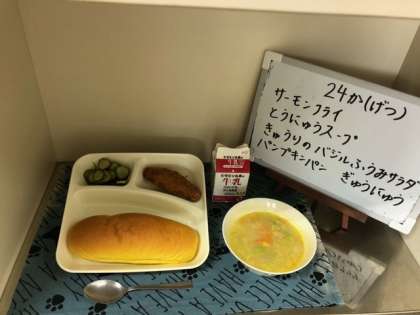 今日の給食は、「サーモンフライ」「豆乳スープ」「きゅうりのバジル風味サラダ」「パンプキンパン」「牛乳」でした。