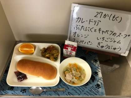 今日の給食は、「カレードリア」「豚肉とキャベツのスープ」「オレンジ」「コッペパン」「いちごジャム」「牛乳」でした。