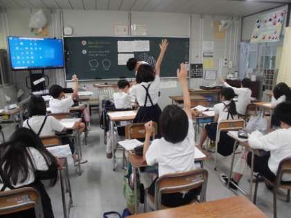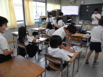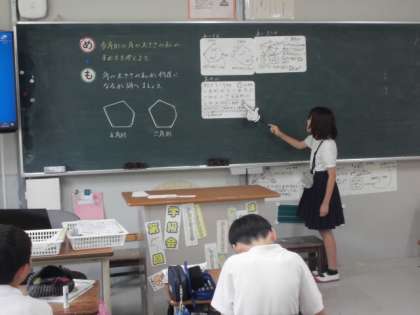 5年生が算数で「多角形の角の大きさ」について学習をしました。それぞれの考え方をホワイトボードに記入して発表しました。それぞれにいろいろな考え方で答えを出すことができました。発表の後も学び合いをしていました。