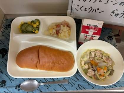 7月1日(月)の給食は、「鶏肉とてぼ豆のスープ煮」「ベーコンとじゃがいものチーズ焼き」「きゅうりとコーンのサラダ」「黒糖パン」「牛乳」でした。