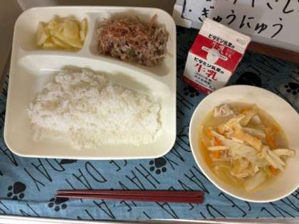 今日の給食は、「ゴーヤチャンプルー」「かつおぶし」「五目汁」「あげ焼きじゃが」「ごはん」「牛乳」でした。