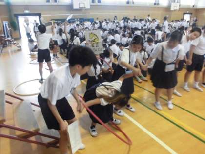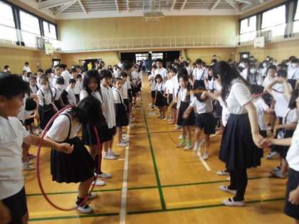 児童集会で、「フラフープちえのわ」をしました。たてわり班ごとに全員で手をつないでフラフープを回していきました。どの班もみんなで力を合わせて楽しむことができました。