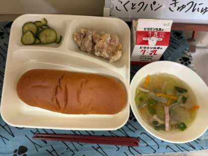 今日の給食は、「鶏肉のからあげ」「ハムとはるさめのスープ」「きゅうりの中華あえ」「黒糖パン」「牛乳」でした。