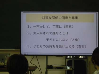 5年生の出前授業に引き続き、いわさきさんに講師をしていただき、PTA性教育講演会を行いました。人間関係についてや子どもの人権など子どもとの接し方の話をはじめ、奥深い性教育のお話をお聞かせいただきました。参加した保護者の方も真剣で、大切な内容のスライドをスマホで撮る姿も見られました。